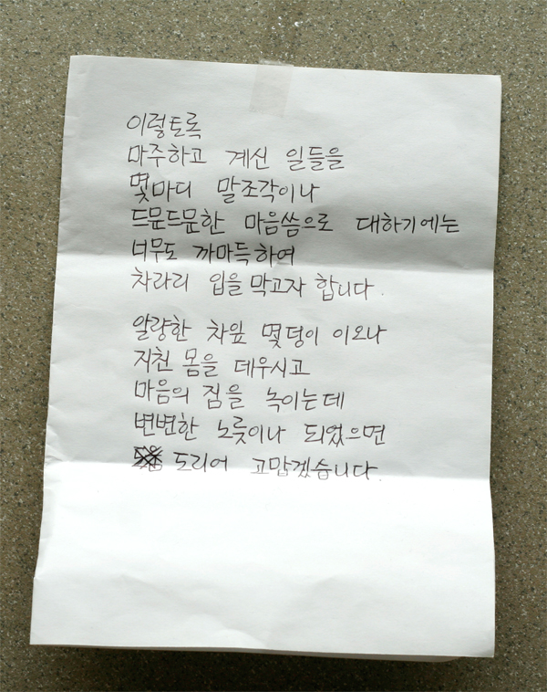 순천향병원 장례식장에 마련된 용산범대위 상황실로 보내주신 녹차에 동봉된 편지입니다.