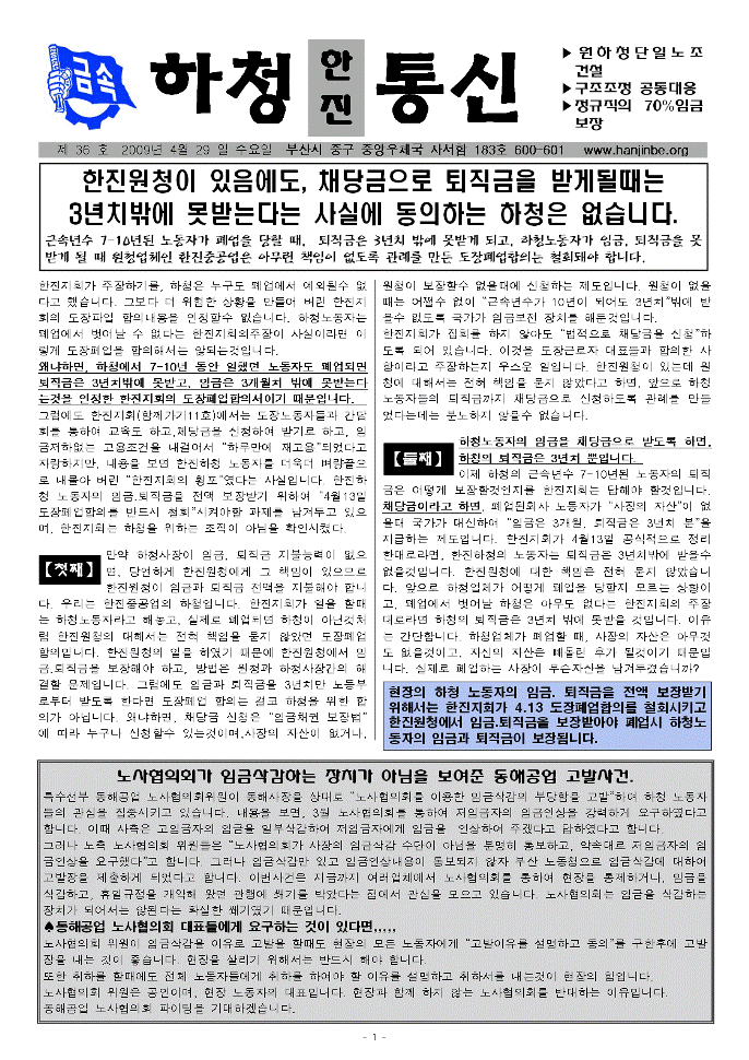 한진원청이 있음에도, 채당금으로 퇴직금을 받게될때는 3년치밖에 못받는다는 사실에 동의하는 하청은 없습니다.