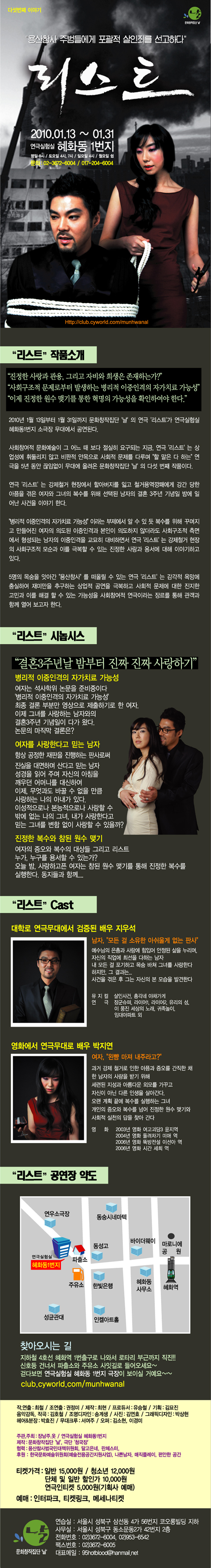 올해 2010년에도 중단 없이 연극"리스트"를 준비하여 여러분들을 찾아 뵙게 되었습니다.