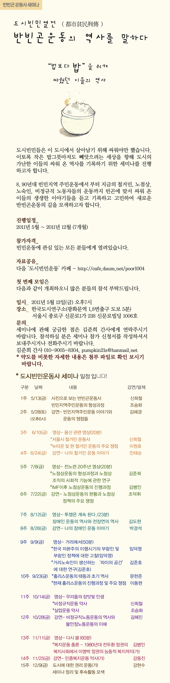 * 한국 도시빈민운동사(반빈곤운동사) 세미나 '도시빈민열전'이 진행됩니다. 관심있는 분들의 많은 참여 바랄게요.