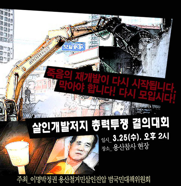 이제 우리에게는 살인진압 진상규명과 책임자 처벌과 동시에 용산 4지구에 대한 살인개발을 중단시키기 위한 실천이 절실히 요구되고 있습니다. 용산 4지구에는 연일 삶의 터전을 부수는 포크레인 굉음이 나고 있습니다. 그 굉음은 가난한 철거민, 용산 4지구 상공 철대위 동지들의 절규입니다. 또다시 유가족의 가슴에 대못을 박는 비통함의 소리입니다. 3월 25일 오후 1시, 열사들의 한이 서린 남일당 건물 앞으로 모입시다. 살인개발 저지 총력투쟁결의대회에 집중합시다! 임대상가, 개발기간 임시상가, 순환식 개발 등 철거민들이 수십년간 외치며 싸워온 기치를 들고 용산 4지구 살인개발을 막기 위해 모입시다!