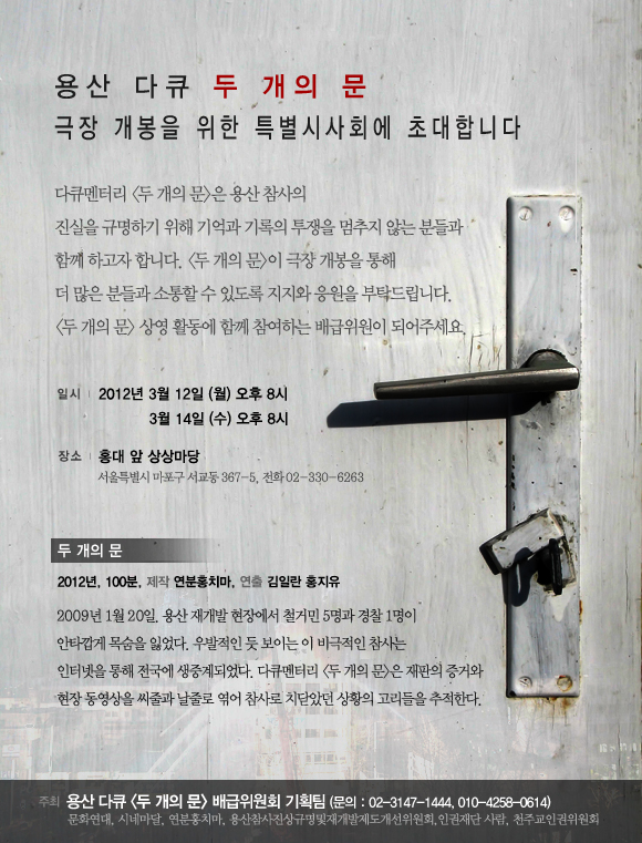 이러한 때에, 용산참사의 진실규명을위해, 2009년 1월 20일 그날의 사건을 재구성한 다큐 <두개의 문>(2012, 100분, 연분홍치마 제작, 김일란 홍지유 연출)의 극장개봉을 준비하고 있습니다.