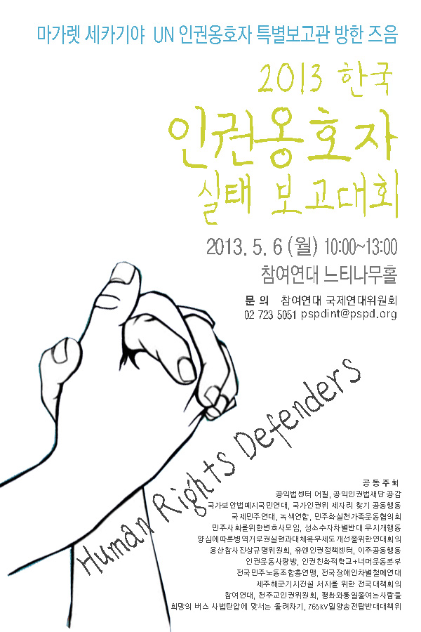 3. 한국 인권시민사회 단체들은 유엔 인권옹호자 특별보고관 마가렛 세카기야씨의 공식 방문을 계기로 한국 인권옹호자의 실태를 널리 알리기 위해 5/6(월) 오전 10시 참여연대 느티나무홀에서 ‘2013 한국 인권옹호자 실태 보고대회’를 아래와 같이 개최할 예정입니다.