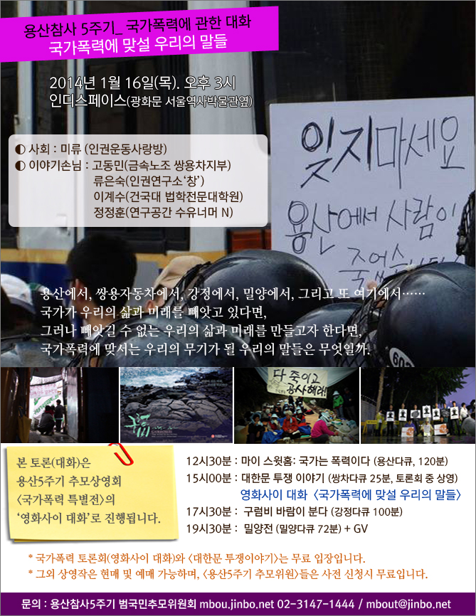 - 국가폭력에 함께 맞선다는 것은 무엇일까. 국가폭력이 어떤 구조라면, 그것에 맞서는 우리의 힘들은 어떻게 모아야 할까. 용산에서, 쌍용차에서, 강정에서, 밀양에서 이어지는 연대의 힘들은 어떻게 더 확장될 수 있을까. 국가폭력에 맞서는 우리의 과제는 무엇일지 찾아보자.