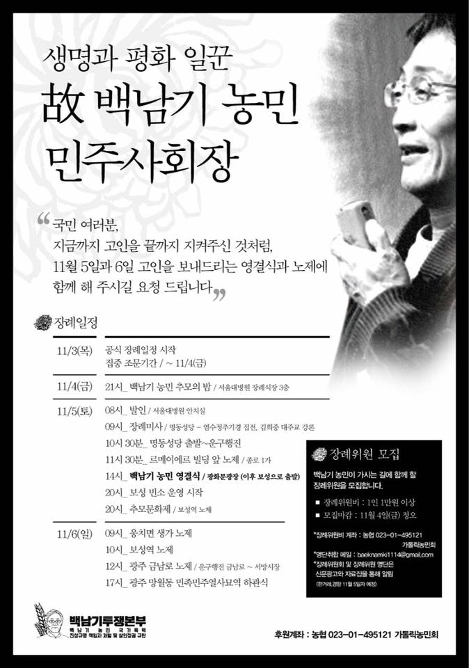 [생명과 평화 일꾼 故 백남기 농민 민주사회장 주요 일정]