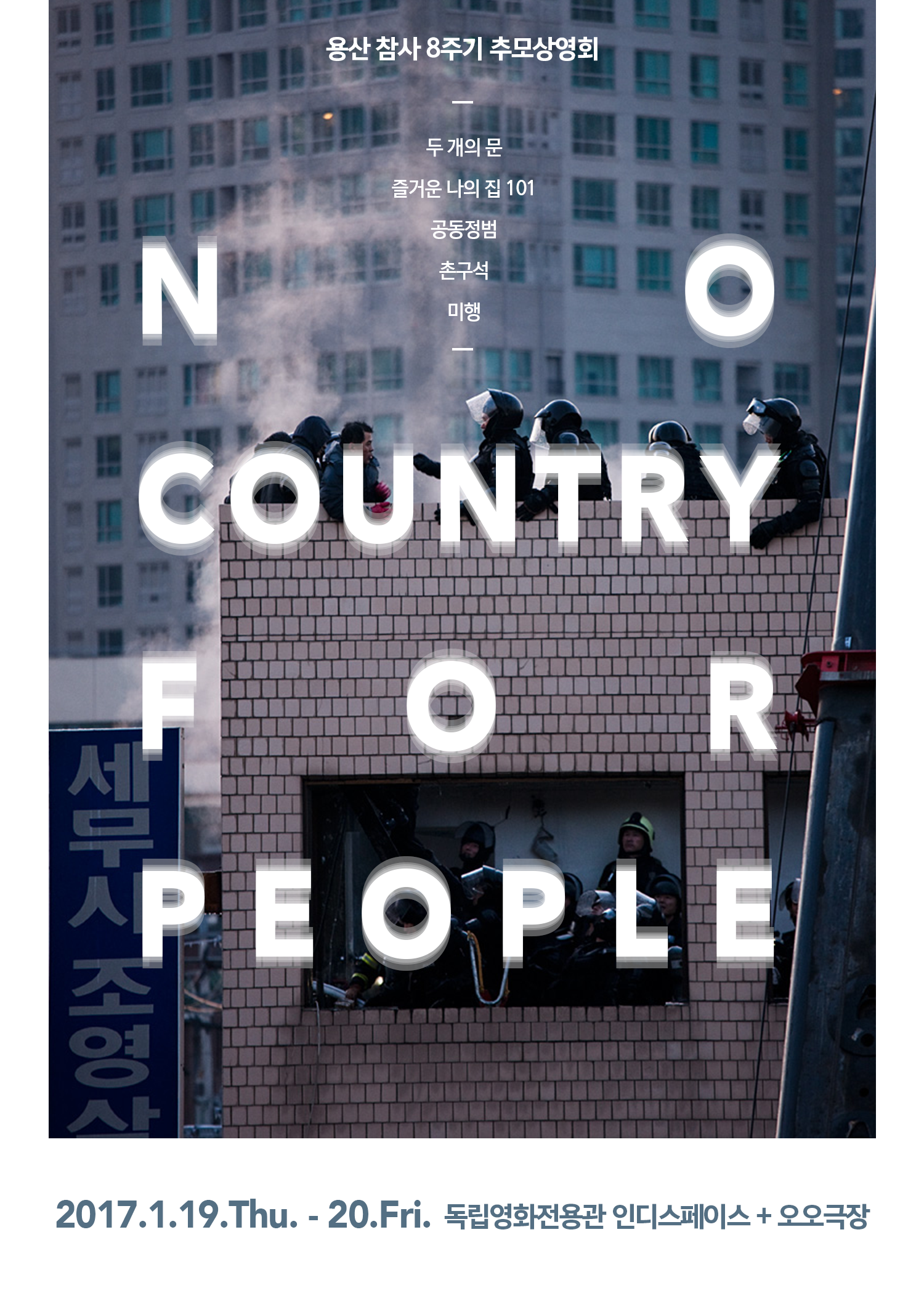 독립영화전용관 인디스페이스와 오오극장이 오는 1월 19일(목)부터 20일(금)까지 이틀간 [용산 참사 8주기 추모상영회: No Country For People](이하 No Country For People)을 개최합니다. 상영작은 김일란, 홍지유 감독의 <두 개의 문>(2011), 련 감독의 <즐거운 나의 집 101>(2015), 이혁상, 김일란 감독의 <공동정범>(2016), 태준식 감독의 <촌구석>(2016), 이송희일 감독의 <미행>(2016)까지 총 5편이 준비되어 있습니다.
