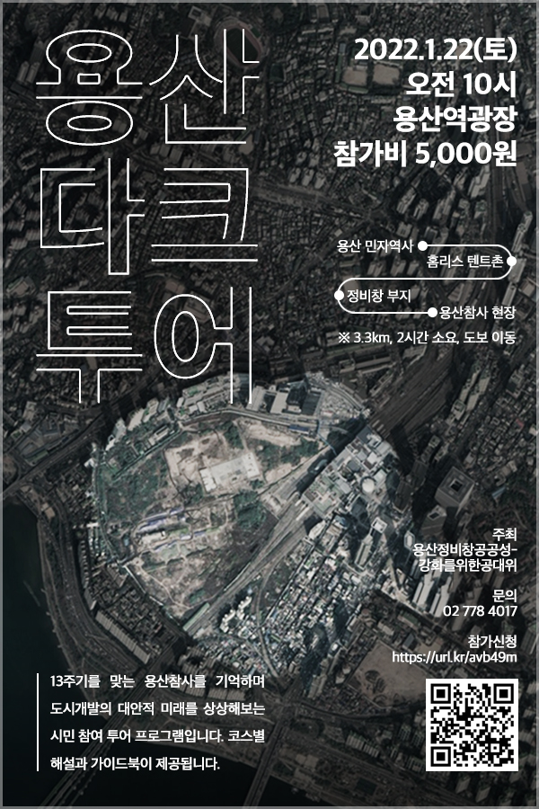 오는 용산참사 13주기(1월 20일)에 즈음해, 용산참사를 기억하고 용산정비창 개발의 공공성 강화와 100% 공공주택 공급 등 대안적 미래를 상상하는 시민참여 투어 프로그램 진행하고자 합니다.